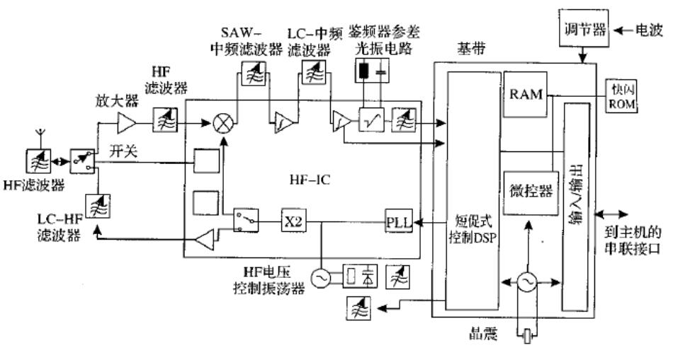 圖1藍(lán)牙無線電系統(tǒng)(最少兩個芯片)的典型方案右邊為基帶處理器,左邊為高頻模塊,附加濾波器和天線開關(guān)元件