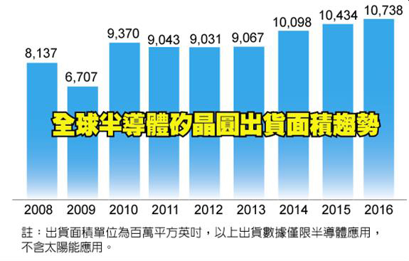 依據(jù)國(guó)際半導(dǎo)體產(chǎn)業(yè)協(xié)會(huì)(SEMI)旗下硅晶圓制造者部門(mén)SMG(Silicon Manufacturers Group)公布的年終硅晶圓產(chǎn)業(yè)分析報(bào)告顯示,2016年全球半導(dǎo)體硅晶圓出貨總面積達(dá)10,738百萬(wàn)平方英吋,年成長(zhǎng)率達(dá)3%,連續(xù)3年創(chuàng)下出貨量歷史記錄新高。
