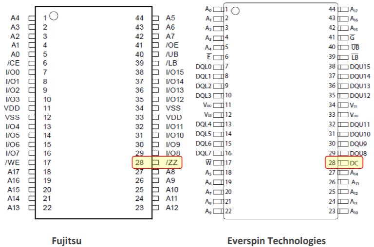 MRAM,組織為256kx16,由標稱3.3V電源供電,并與FRAM兼容。兩款產品均使用標準SRAM并行地址(A0-16)、字節(jié)寬雙向數據引腳(DQ0-7)和控制信號(/E、/W、/G)。每個都可以由一個公共定時接口支持,并將用作隨機存取讀/寫存儲器,在斷電時無需外部電池即可保留數據。Everspin不支持/ZZ睡眠功能。/ZZ可能需要上拉。