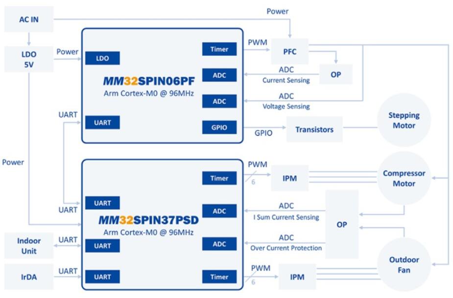 MM32SPIN06微控制器的空調外機方案如下圖所示,其中MM32SPIN37PSD(2個ArmCortex-M0內核,最高主頻96MHz)和MM32SPIN06PF(基于ArmCortex-M0內核的高性能32位微控制器,最高工作頻率可達96MHz)為主控制器。