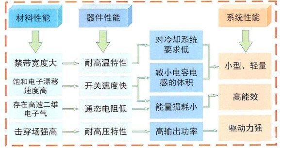 相比主流的第一代半導體——硅材料,碳化硅的禁帶寬度是硅的3倍;導熱率為硅的4-5倍;擊穿電壓為硅的8-10倍;電子飽和漂移速率為硅的2-3倍。