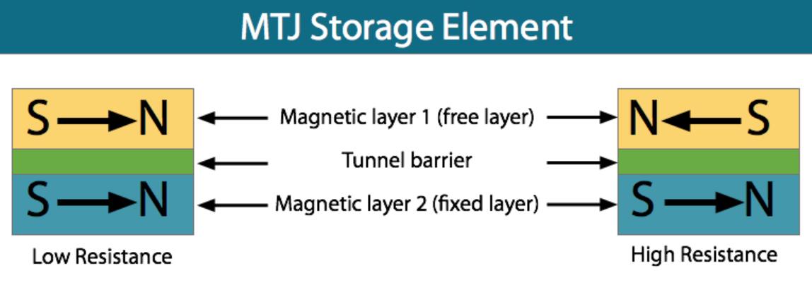 當自由層的磁矩平行于固定層時,MTJ器件具有低電阻,而當自由層磁矩與固定層矩反平行時,MTJ器件具有高電阻。