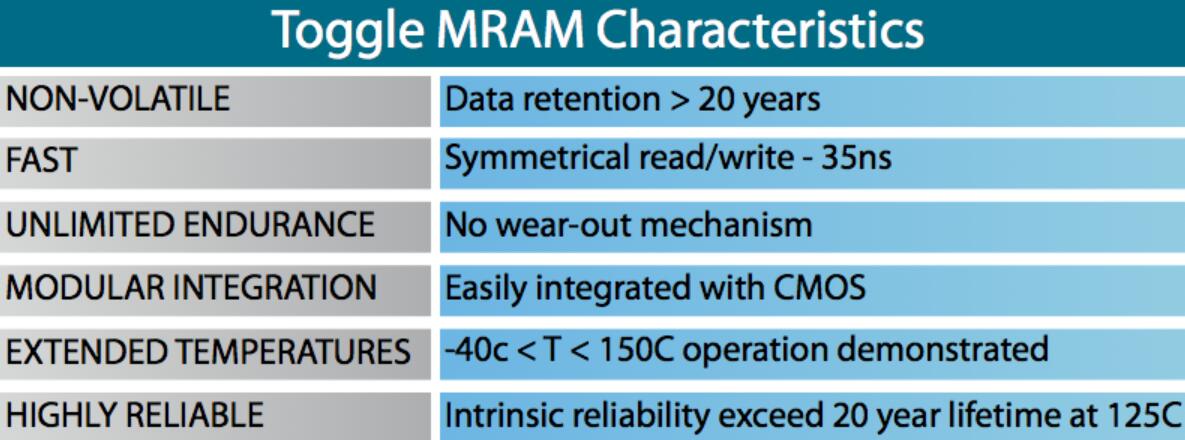 切換MRAM使用1個晶體管,1個MTJ單元來提供簡單的高密度存儲器。Everspin使用獲得專利的Toggle電池設計,可提供高可靠性。數據在溫度下20年始終是非易失性的。