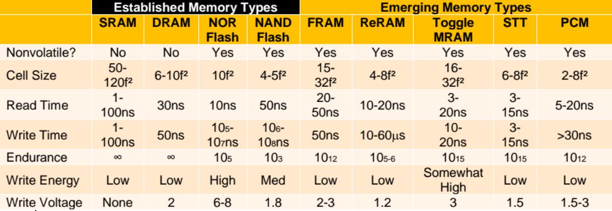 SRAM,DRAM,NOR和NAND閃存)1的一些重要特性。