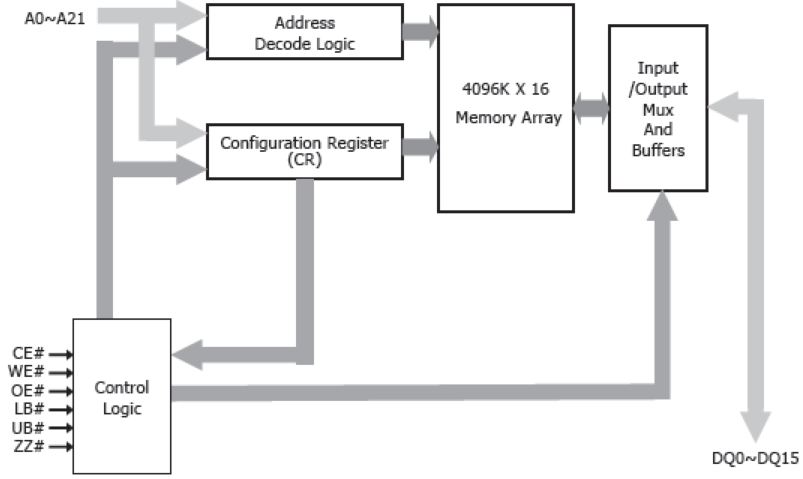 pSRAM,使用DRAM型存儲(chǔ)器單元,但該器件具有無刷新操作和極端低功耗技術(shù)。接口與低功耗異步類型SRAM兼容。該設(shè)備組織為4,194,304字x16位。