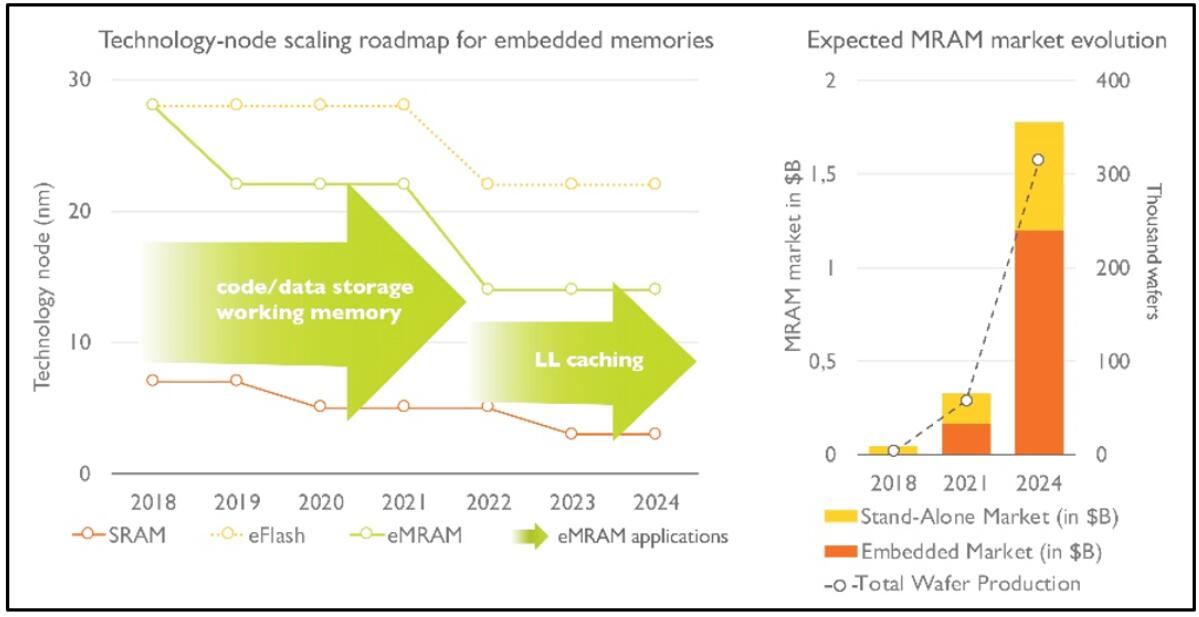 從目前的市場角度來看,雖然現在的NAND和DRAM在未來幾年占據主導地位,但是MRAM預計將會有顯著成長。根據市場研究機構報告,到2024年的STT-MRAM市場可望達到 18億美元規模(包括12億美元規模的嵌入式方案,以及約6億美元的獨立組件),2018到2024年間的復合年成長率為85%,總產量超過30萬片晶圓(wafer production volume),同期間復合年成長率為126%。