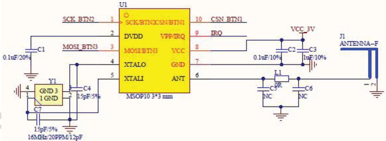 電源加兩個電容,如果用LDO 供電,分別取值1uF 和0.1uF 用以濾波;如果用紐扣電池供電,電容分別取值10uF和10uF 用以穩壓。