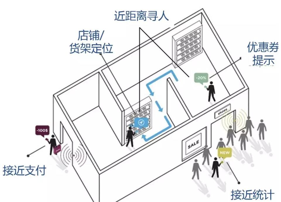 基于位置的服務(LBS)成為互聯網巨頭在實現O2O的重要手段。BLE的廣播信號是每一臺手機都可以收到的信號,一個顧客在接近商鋪時就可以收到商家推廣廣告。在微信中的搖一搖“周邊”中,主要采用這種技術。