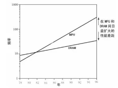 芯片集成度的不斷提升,給分立存儲(chǔ)器帶來(lái)了兩大挑戰(zhàn):首先:集成度和工藝開(kāi)始允許片內(nèi)集成更多的存儲(chǔ)器;其次,存儲(chǔ)器的速度發(fā)展遠(yuǎn)遠(yuǎn)趕不上于MPU的速度,MPU速度以每年60%在成長(zhǎng),而存儲(chǔ)器只有10%。二者速度之間增長(zhǎng)的差異巨大,如下圖所示。