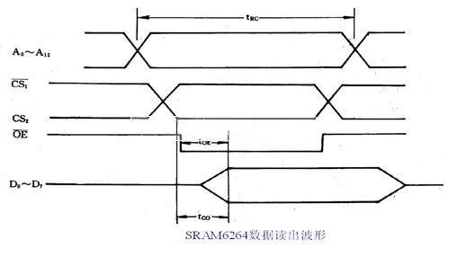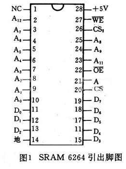(1) 8K×8bit的CMOSRAM芯片 ① 引線功能。6264(6164)有28條引出線,它們包括:A0~A12為13條地址信號線。D0~D7為8條雙向數據線。CS2為兩條選片信號的引線。
