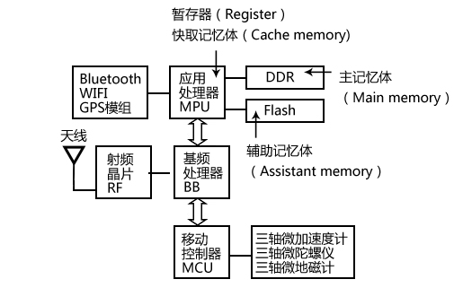 所有的電子產(chǎn)品都必須用到存儲(chǔ)器,而且通常用到不只一種存儲(chǔ)器,由于存儲(chǔ)器的種類繁多,常常讓使用者混淆,我們簡(jiǎn)單說(shuō)明不同存儲(chǔ)器之間的差異,圖三為手機(jī)主要芯片的系統(tǒng)方塊圖(System block diagram),包括:應(yīng)用處理器(Application processor)、基頻處理器(Baseband processor)、運(yùn)動(dòng)控制器(Motion Controller)。