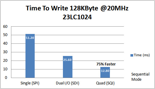 下圖給出了在SPI、SDI和SQI模式下以20 MHz向23LC1024 1 Mb SPI SRAM寫入128 KB存儲內容所需的時間。 從中可看出,SQI比標準SPI快75%。
